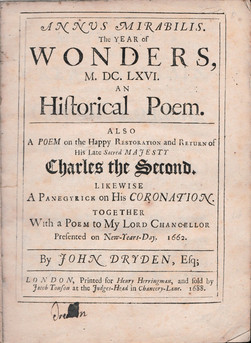 John Dryden Annus Mirabilis. The Year of Wonders, M.DC.LXVI., An Historical Poem. Also a Poem on the Happy Restoration and Return of His Late Sacred Majestey Charles the Second. Likewise a Panegyrick on His Cononation. Together With a Poem to My Lord Chancellor Presented on New-Years-Day. 1662. Henry Herringman and Jacob Tonson, London, 1688. Small 4to, stitch bound in wraps, [20], 116pp, each poem with its own title page. The initial title page dust-affected and small ink-mark at foot o/w VG. (Wing 2240)