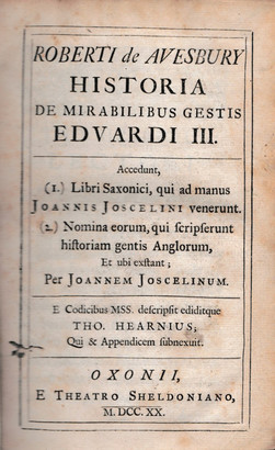 [Robert of Avesbury] Roberti de Avesbury Historia de mirabilibus gestis Edvardi III. Edited from the manuscript by Thomas Hearne. Oxford, 1720. Octavo, full leather, worn & chipped; clean text but worming affects a few words of the preface. pp.lvi, 385, (1). Folding plate.