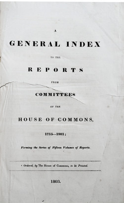 A General Index to the Reports from Committees of the House of Commons 1715-1801; Forming the Series of Fifteen Volumes of Reports. House of Commons, 1803; folio, quarter leather, gilt, poor, crude tape repairs; text complete and clean but title page with large tear, and pp.131/2 with large piece missing from the margin. Uncut.