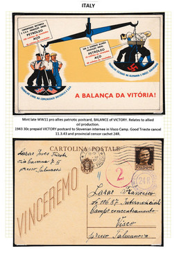 World War Two themes with USA Patriotic cards (8), Dutch anti-Hitler Propaganda, 1945 Italian Anti-Nazi propaganda, plus few postal history items including 1943 card from Trieste to Slovenian internee in Visco camp.