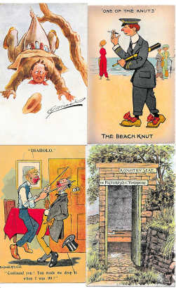 Comic selection, all pre-1940 and mainly PU, with military themes, seaside humour, named artists etc. Fair to fine. (49)