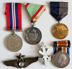 Collection of Medals in plastic sleeves, many with ribbons, including WW2 Defence Medals (11) and Stars (6) including Air Crew Europe (apparent replica); WWI Defence Medal; many foreign including WWI Austrian (2), various Russian and others; also medallions from 19th Century, cap badges, fabric insignia, and others. Varied condition. (approx 100). Also spare ribbons and sundry coins.