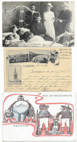 Interesting selection including German Boer War political satire (3), scarce London court card PU 1896, RP horse-drawn delivery cart (said to be from Tabley, Knutsford), coloured art views of Umtali (7, Southern Rhodesia), a curious American bedroom marriage ceremony RP, and scarce RP of a German Gipsy Wedding. Mainly VG/VF (38)