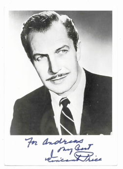 Vincent Price (1911-1993): a fine autographed b/w 6 x 4” photograph, with dedication, signed with fibre pen.