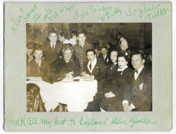 Sophie Tucker: a 1940s photograph of the singer/actress with friends at the La Conga club, New York, signed & inscribed on the mount, additionally signed by the mandolin player Dave Apollon, in souvenir folder. VG.