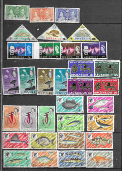 Antigua & Ascension QE2 mint or UM ranges on leaves with many sets plus few stamps of other countries. Some stamps adhering. STC £500+ (c.450)