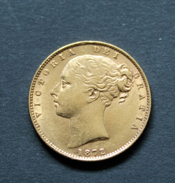 UK 1872 Sovereign, London Mint, WW in relief. Near EF