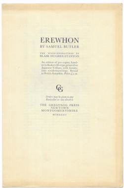 Gregynog Press publications comprising On The Morning of Christ's Nativity 1937, front cover marked, half-title signed by John Hugh Jones; Specimen Pages from Eros and Psyche 1935 (3 examples), Erewhon 1932, and Anne Boleyn 1934 (2 examples); and two publisher's lists.