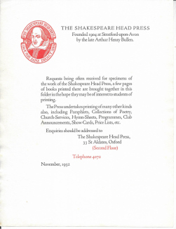 Pages of Books Printed at the Shakespeare Head Press St Aldates Oxford 1932, comprising 16 fine items in original rather worn wrapper, including letter head, Works of Edmund Spenser and Geoffrey Chaucer, etc.