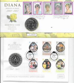 Coin Covers in four ‘Royal Family' printed albums, 1990s, including inset coins to £2 (10) and £5 (7). VG/VF (49). Also some covers without coins.