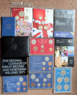 UK Coin sets in issued packs comprising 1967/71 Last Sterling / First Decimal; Year Sets for 1977, 1978, 1980, 1986, 2005, 2006, and 2007; and few single coin packs.