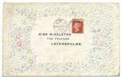 Great Britain 1863 attractive cover containing original Valentine Card, the cover with coloured embossed decoration, the Valentine with paper lace border, printed silk message and fabric applique. Manchester cds for Feb.13th. Few minor tone marks o/w fine.