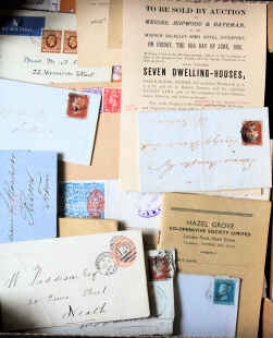 Box of covers, pieces, correspondence and ephemera from 19th Century with much Great Britain including few billheads one with Waterlow receipt stamp, several soldiers' letters, early 20th Century used PPCs, 1893 Stockport Auction notice, Ration Books, several QV period covers, etc. Varied condition. (Large qty.)