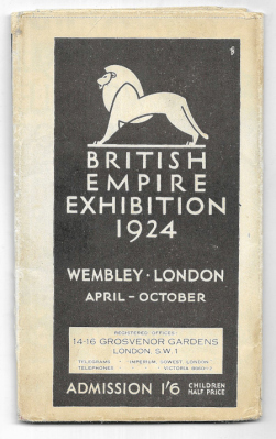 British Empire Exhibition 1924 Wembley Park April-October. Its situation described in relation to the railways of London. Dobson & Molle, 1923, fold-out pictorial map with descriptive text and illustrations to verso. Some small faults.