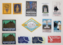 Exhibition Labels 1900s to 1940s, European and USA, mostly arranged on pages, including se-tenant blocks; many attractive items but some stuck down or partially adhering. (100s)