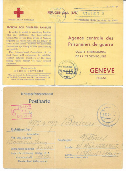 Refugee Mail 1945 USA PC to Geneva from a Jewish American citizen inquiring about his brother last known at Buchenwald Concentration Camp. Also a 1940 PC to Nimes from a French POW in Stalag IXA. (2)