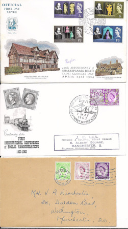 Great Britain 1963-1971 collection of First Day and Commemorative Covers in four albums with some duplication, various postal markings; mostly illustrated with better items noted including 1963 Lifeboat phosphor, 1963 Red Cross phosphor, 1963 Compac phosphor (2), 1964 Shakespeare phosphor, 1964 Forth Bridge plain & phosphor combined, 1965 Churchill with HOUSE OF COMMONS cds and CHURCHILL / OXFORD cds, 1967 Discoveries with BFPO 1000 h/s, 1968 Anniversaries with WOMEN'S SUFFRAGE h/s, and 1969 Investiture NETTLEHAM h/s. Mixed quality. (503)