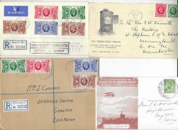 Great Britain George V covers & cards including 1911 First UK Aerial Post, 1925 Wembley 1d with Empire Exhibition slogan, 1935 Jubilee FDCs (7) including set of four with plate blocks, and 1936 advertising cover. Good to fine. (12)