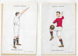 Godfrey Phillips (silk) Football League Colours 1920 (brown print) selection in mixed condition; Swansea, Middlesbrough, Liverpool, Leeds, Brighton, Northampton, Reading, Notts Forest, Stockport, Stoke, Coventry, and Bolton all excellent, others with toning to varying degrees of which 9 are Rugby League. Also black print Liverpool (VG) and Middlesbrough (slight tone marks). (28)