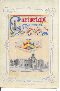 Woven Silk Cartwright Memorial Inaugural Exhibition Bradford 1904, plus three related PPCs and a commemorative medallion. VG