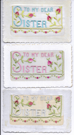 WWI Embroidered silks To My Dear Sister, a duplicated accumulation, most with blue lettering, five with lettering in pink, and one in silver. VG/Fine. (51)