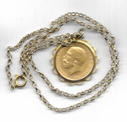 UK 1912 Sovereign EF in gold hallmarked pendant with matching chain. Total weight 15grms.