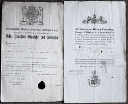 Various documents including 1838 Passport signed by Henry Canning; 1816 Passport issued by the Kingdom of Denmark & Norway to one William Clifford; British Passports of 1867, 1881, 1896 and 1901, variously signed; and a 1970 Order of the British Empire with autopen signatures of Queen Elizabeth II and Prince Philip.