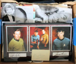 Carton of Autographs with many signed photos, plus signed pages, cut signatures etc, mostly drawn from the world of Entertainment. Many well-known names. (100s)