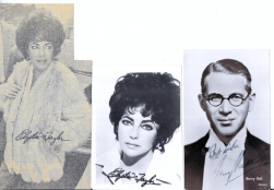 Autographs of entertainers including signed photos of Elizabeth Taylor (2, one a signed cutting), Frankie Howerd (with covering letter from his secretary), Henry Hall (smudged) & Sarah Lancashire; signed pages by Howard Keel and Valerie Singleton, and other items. The signatures of Elizabeth Taylor not guaranteed and offered 'as is'.. (20)