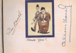 Autograph album with a few signatures including Laurel & Hardy and Frank Sinatra, the latter in pencil and rather faint.