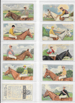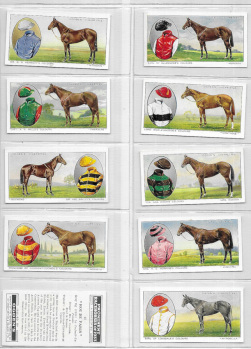 Horse Racing sets in modern album comprising Ogden's Owners Racing Colours & Jockeys 1914, Derby Entrants 1926, Steeplechase Celebrities, Derby Entrants 1928 and Trainers and Owners' Colours 1st & 2nd series; Anstie Racing Series 1922 (both sets, fair to good, most with rounded corners); and Wills Racehorses & Jockeys 1938. Generally good to VF.