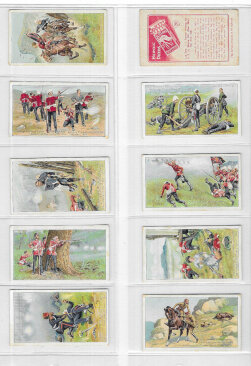 Military interest: seven sets in modern album including Wills (Scissors) Heroic Deeds 1913; Player Regimental Colours and Cap Badges (Regulars) Colonial & Indian Army Badges, War Decorations & Medals and Army Life, and Louis Gerard Modern Armaments. A few cards slightly marked, some backs of War Decorations with light colour offset o/w VG.
