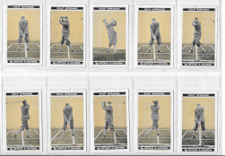 Sports interest, a collection of 17 sets in album including Churchman Sporting Trophies (the set of 25) and 3 Jovial Golfers; Carreras (Turf) Sports Series and Famous Footballers; Player Speedway Riders and Racing Caricatures; Ogden Pugilists in Action and Steeplechase Trainers and Owners' Colours; Gallaher Lawn Tennis Celebrities; Boguslavsky Sports Records 1st & 2nd series; and Hignett International Caps and Badges. VG or better, mainly excellent. Cat (Murray) £1580.