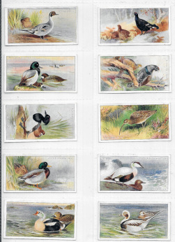 Three modern albums with 36 cigarette card sets, chiefly Wills, Player and Ogden's, plus Churchman Legends of Britain; includes Player Game Birds & Wildfowl, Cricketers 1934, & History of Naval Dress; Ogden The Story of Sand; and various others. Mixed condition.
