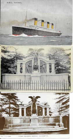 Titanic related comprising three of the ship (including an RP by J.M. Vauxhall), a Bamforth In Memoriam card, and two RPs of the Southampton monument. VG/VF (6)