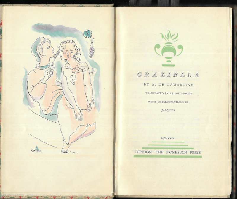 A. De Lamartine Graziella, The Nonesuch Press, 1929, translated by Ralph Wright, 30 illustrations by Jacquier; decorated cloth, in slipcase.