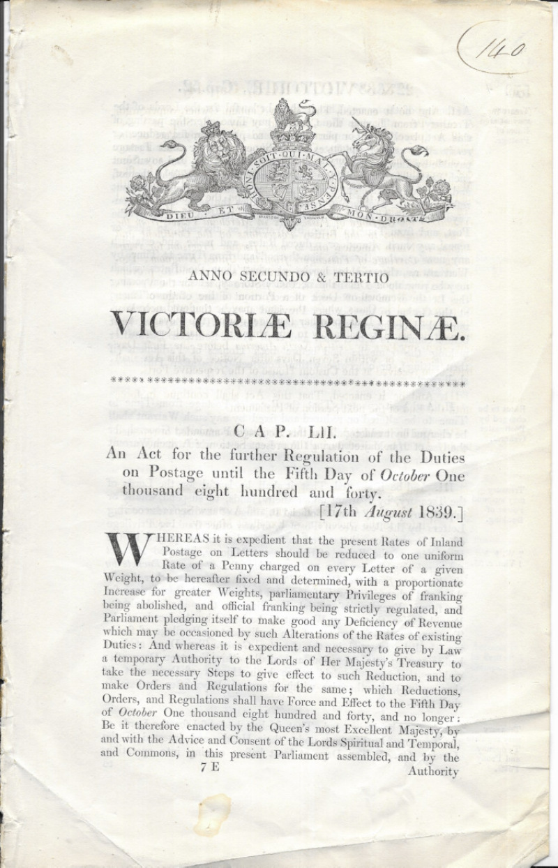 Act of Parliament, August 1839 for the introduction of the Penny Post and the abolition of the parliamentary privileges. Foolscap. 6pp. Some creasing. [This Act paved the way for the introduction of the first adhesive postage stamps the following May]