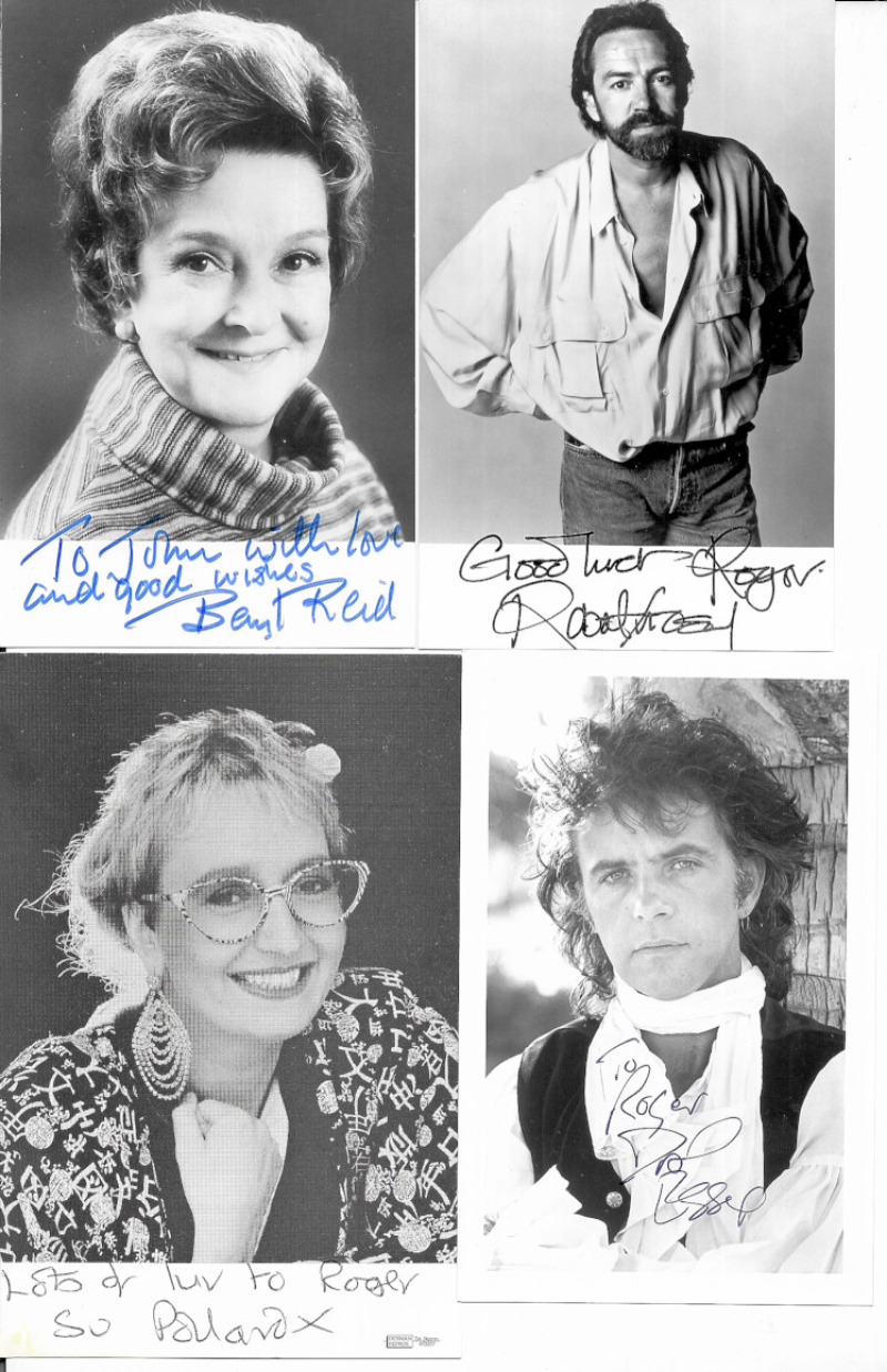 Album of autographed photos including Jim Davidson, Robert Lindsay, Beryl Reid, Su Pollard, David Essex, Richard Briers, Joan Turner, Anette Crosbie, Ian Carmichael, Sasha Distel, and other entertainers. Photos 6 x 4” or smaller. (39)