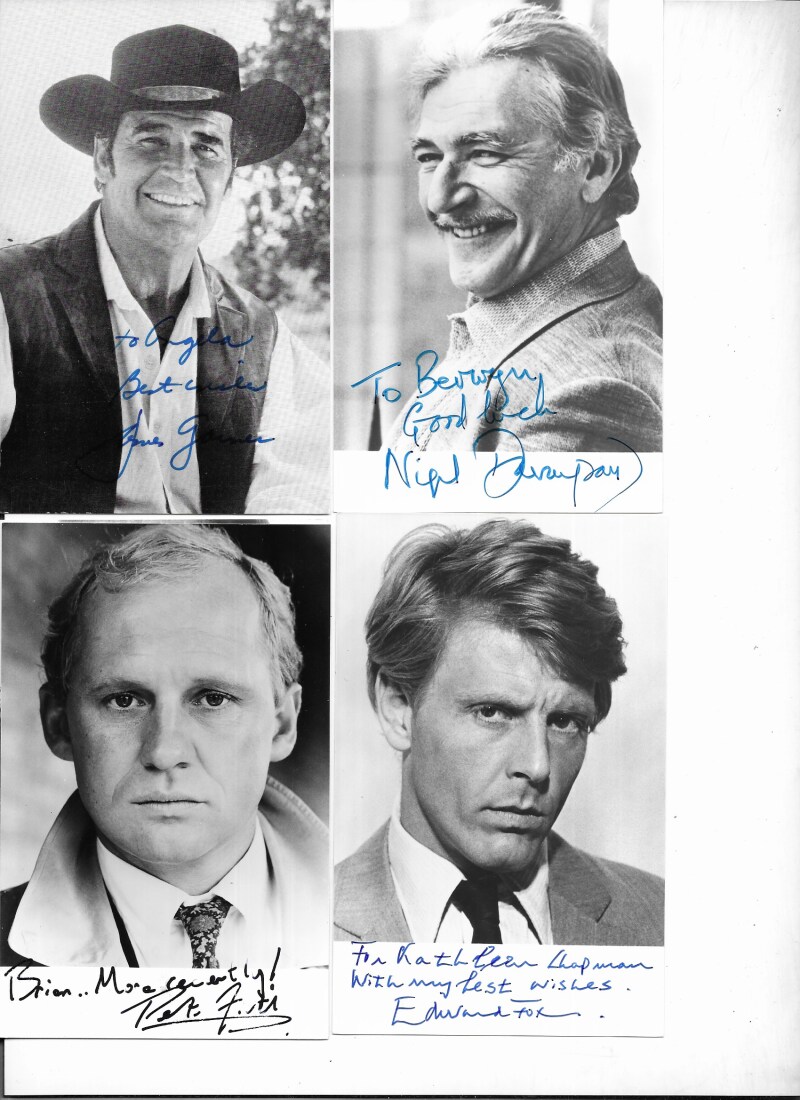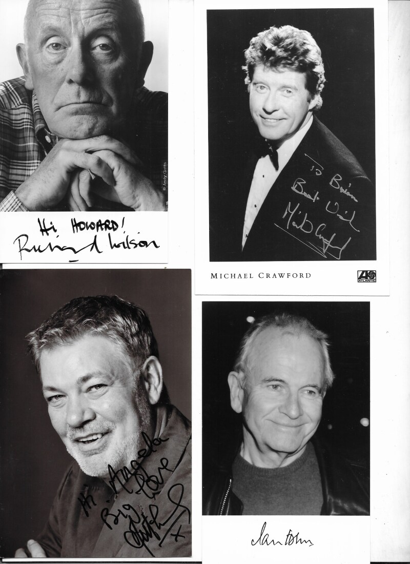 Album of autographed photos of entertainers, TV presenters, etc, PC size, including James Garner, Cicely Courtneidge, Nigel Hawthorne, Lee Evans, Tom Courtenay, Nigel Davenport, Richard Wilson, Edward Fox, Ian Holm, Richard Briers, Michael Crawford, George Sewell, and other well-known. (64)