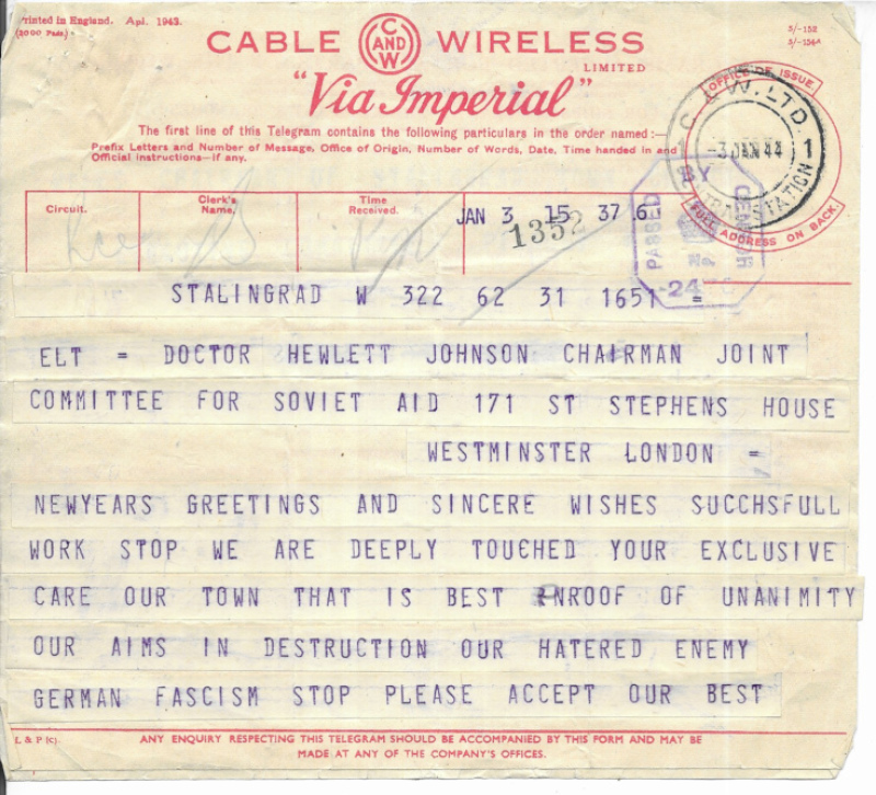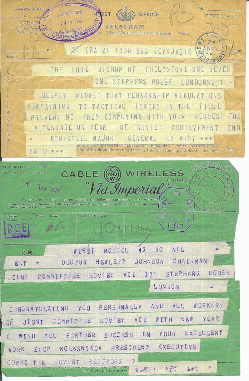Anglo / Soviet Union Relations WW2: a group of Telegrams 1942-1944 concerning The London Soviet Aid Committee and related matters,