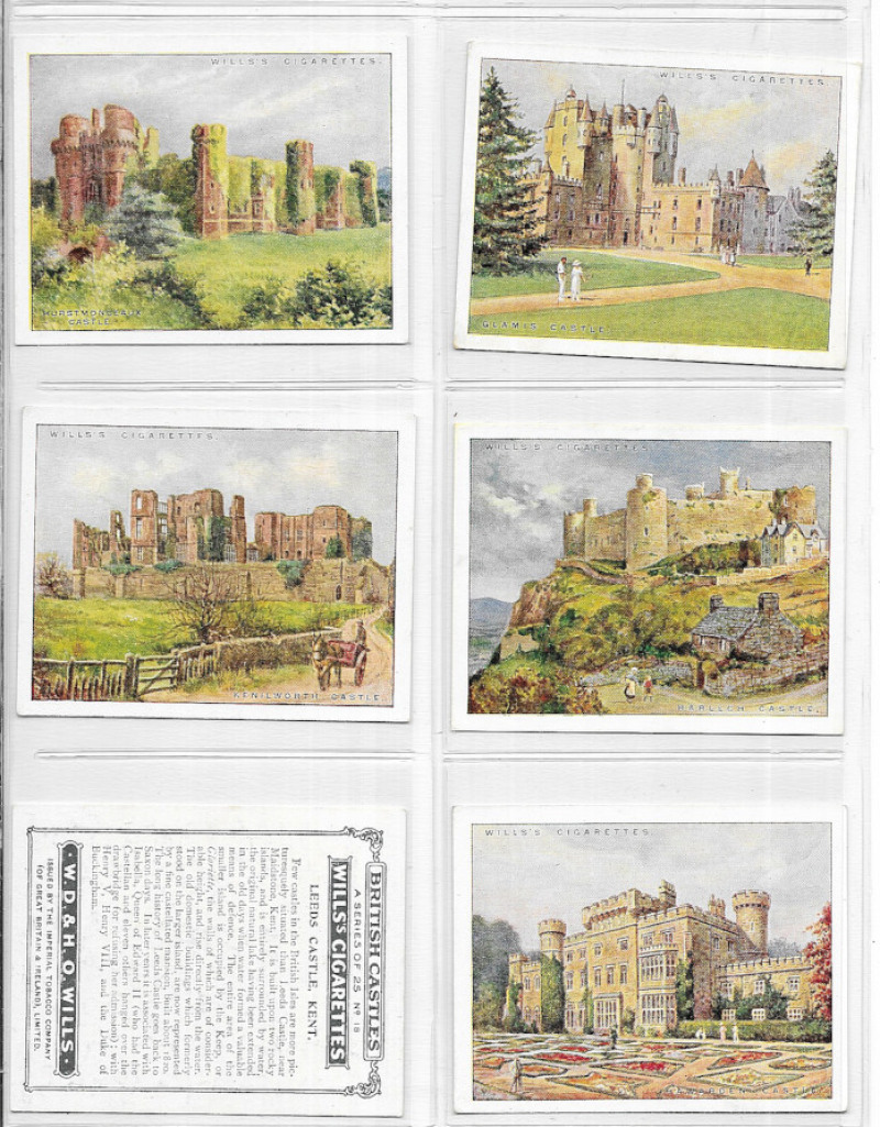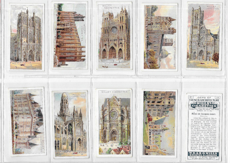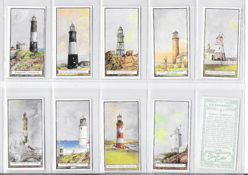 Architecture interest, eight sets in modern album including Wills Lighthouses (New Zealand issue), Gems of French Architecture and British Castles; Richard Lloyd Old Inns (first series); Phillips The Old Country; and Cope Castles (two sets). VG or better, mostly excellent.