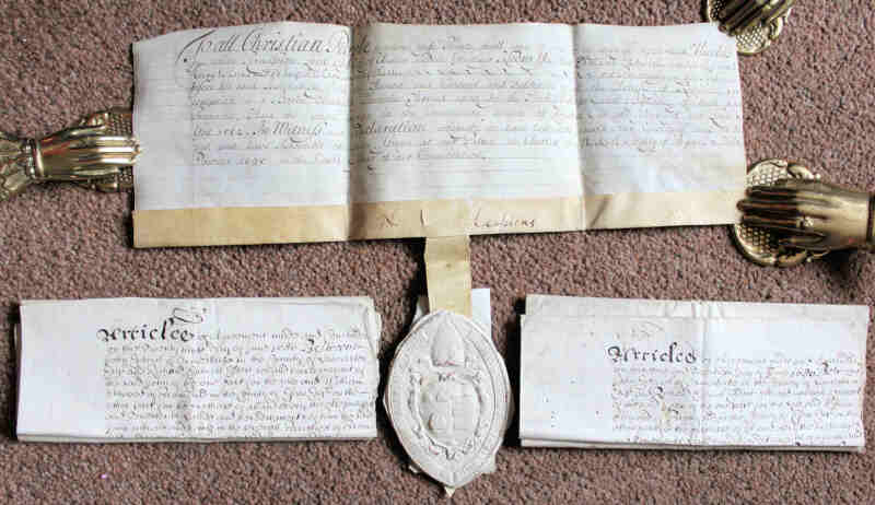 Archive of Documents and Correspondence 17th Century to 1830s relating to the Entwistle family of ‘Foxholes Estate' Rochdale and Ormskirk, including vellum Indentures of 1686 (2), Articles of Agreement 1686 (2), 1695 appointment of Edmund Entwistle as Archdeacon of Chester with Seal of the Bishop of Chester, all in good condition; later correspondence etc in mixed condition. (26 items)