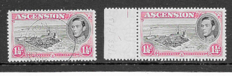 Ascension 1953 1½d Black & Rose-Carmine Perf 13, a FU example showing the ‘Davit Flaw' and an UM normal for comparison,