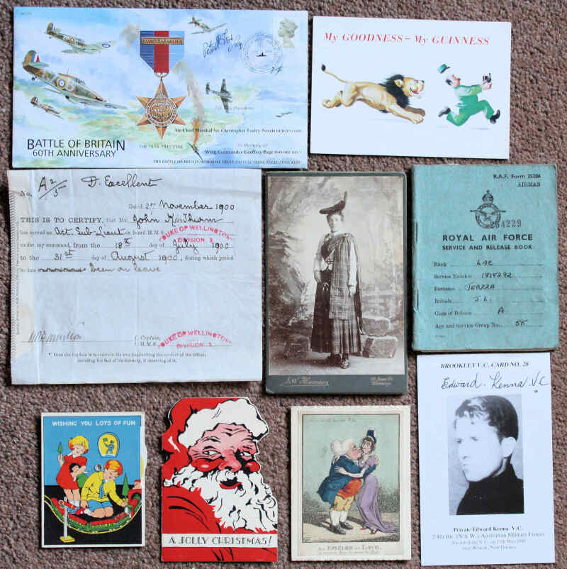 Assorted ephemera with greetings cards, military and maritime interest with few autographs, and documents, 1850s to 1960s. (63 items)