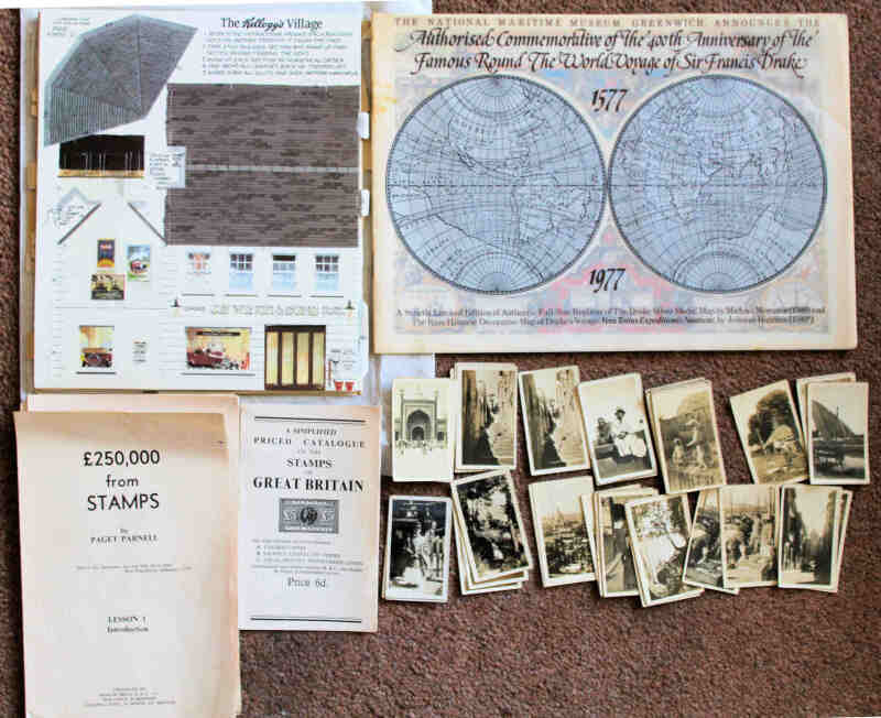 Assortment with Kellogg's Village and 1960's Garage stand-up models in uncut kit form; a 1930s stereoscopic viewer with 22 pairs of Cavander's views; and three Brooke Bond wall charts for different sets. The Cavander's cards rather worn. Also few unrelated items.