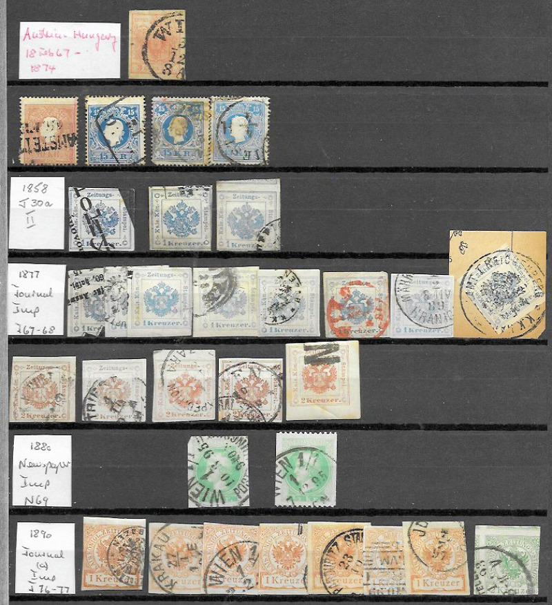 Austria 19th Century collection neatly annotated in stockbook with some scarcer perf types and much interest in cancellations; includes good selection of postally used Imperial Journal stamps, better high values, few multiples on piece, some Levant & Austrian Italy etc. Generally good to fine. The stockbook also includes some mainly 1920s mint Poland. (Several 100s)