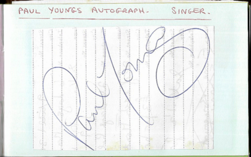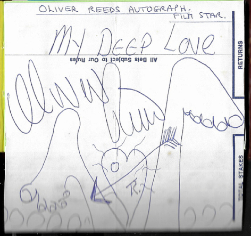 Autograph album with a few signatures including Paul Young, and Oliver Reed with cartoon on a betting slip. (8 autographs)