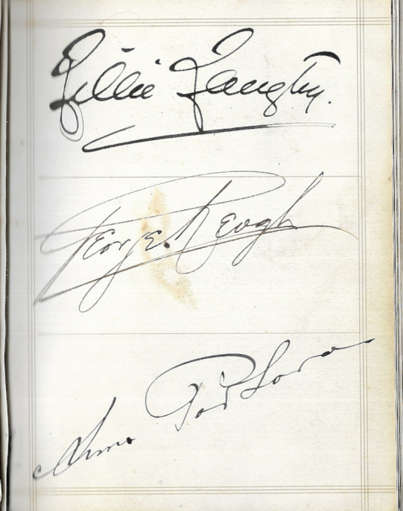 Autograph album with over 100 signatures obtained 1860s to WWI, musical & theatrical including Ellen Terry, Lillie Langtry, Luigi Arditi, Dion Boucicault, Carl Rosa, Tom Thumb, Wilson Barrett, and their contemporaries, many signatures ‘back to back'. Also 22 cut signatures mounted on a page and loosely inserted.
