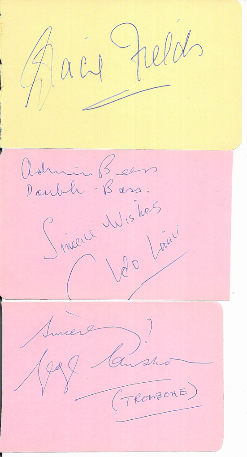 Autographed pages in small albums & loose, 1960s, mainly musicians & vocalists, including George Melly, Gracie Fields, Anna Neagle, Cleo Laine, George Chisholm, Kenny Ball, and many classical performers. Signatures ‘back to back'. (Few 100)