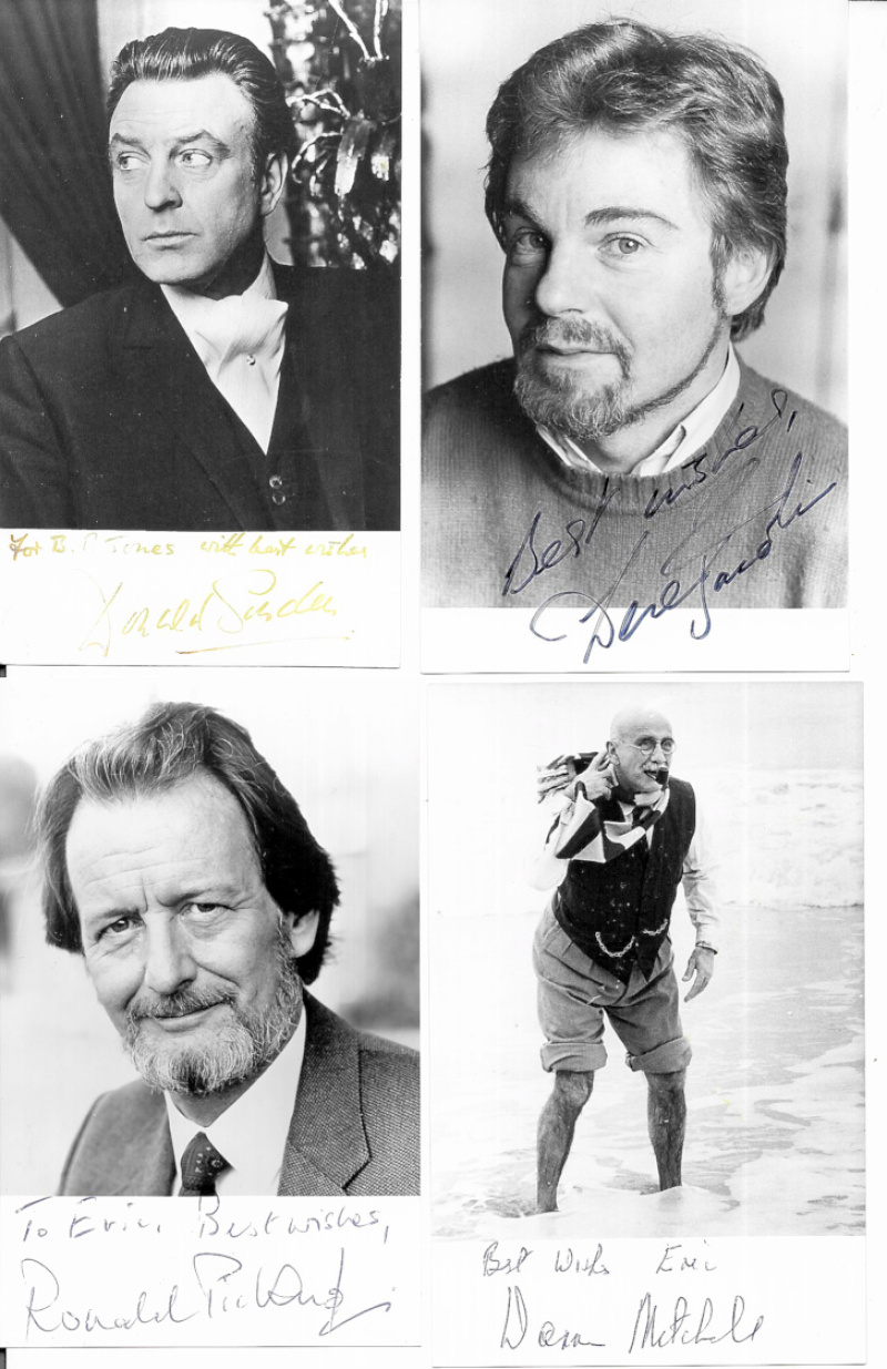 Autographed photos, few cuttings & FDCs, of male celebrities including Derek Jacobi (2), Harry Secombe, Peter Andre, David Baddiel, Donald Sinden (2), Edward Fox, Bill Beaumont, Warren Mitchell, Ronald Pickup, James Bolan and other well-known, plus couple of printed signatures. (58)